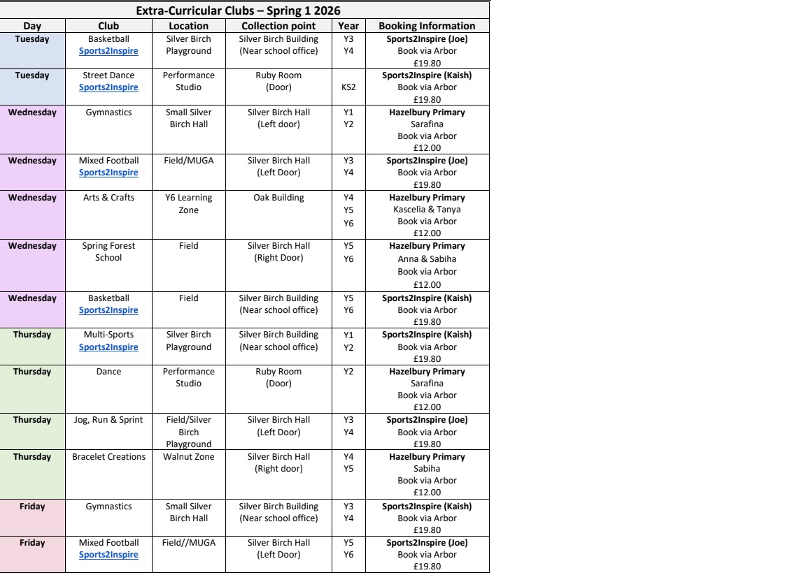 The table below details what clubs are available and how to book a place for your child. The costs for each club are shown below. This is a block booking. Please be aware when making a booking that individual sessions will not be refunded if you choose for your child to attend another school event on the same day. All payments must be made via Arbor on your child’s Wraparound Care account before you reserve their place. You will be able to select your child’s chosen club on Tuesday 16th December 2025 at 07.00pm. Places will be allocated on the system on a first come first served basis and the club will show on your child’s calendar. When the club is full, you will no longer be able to book a place for your child.